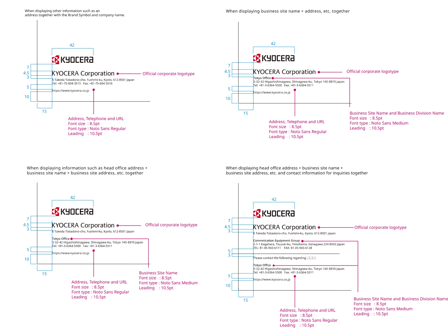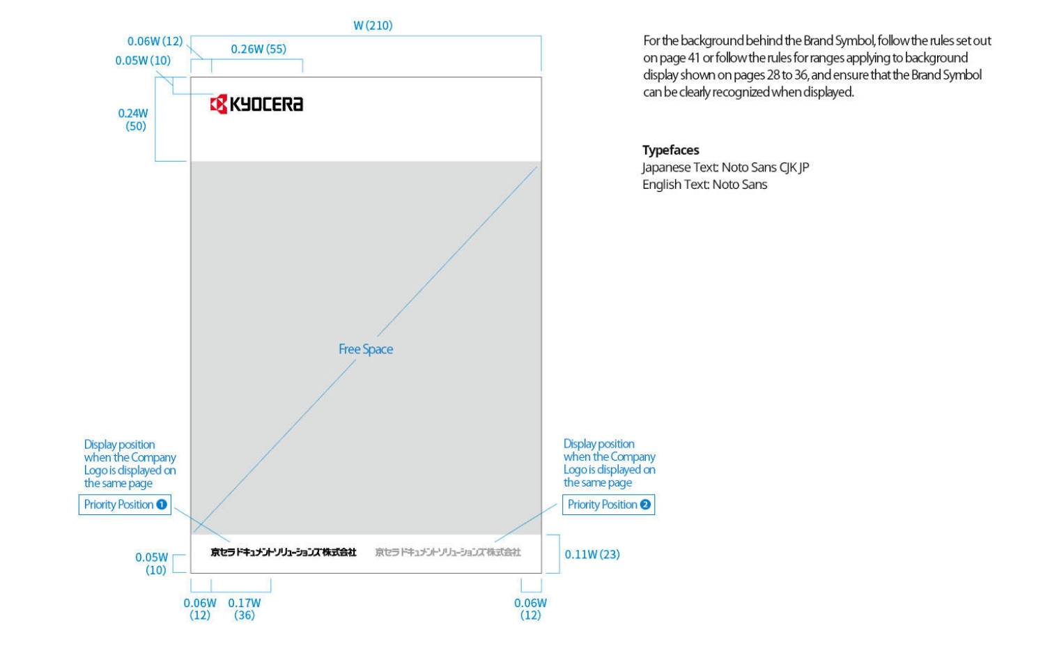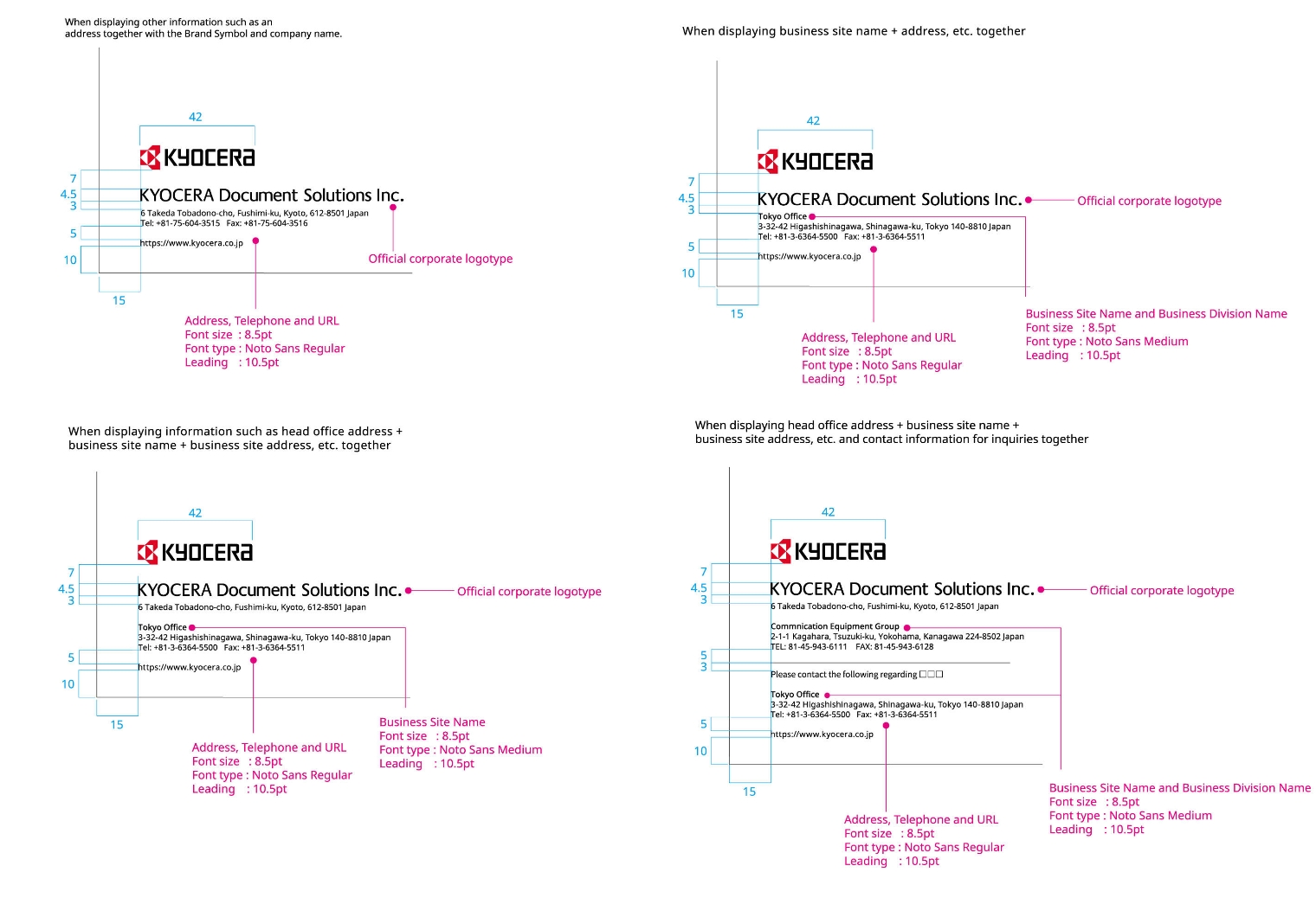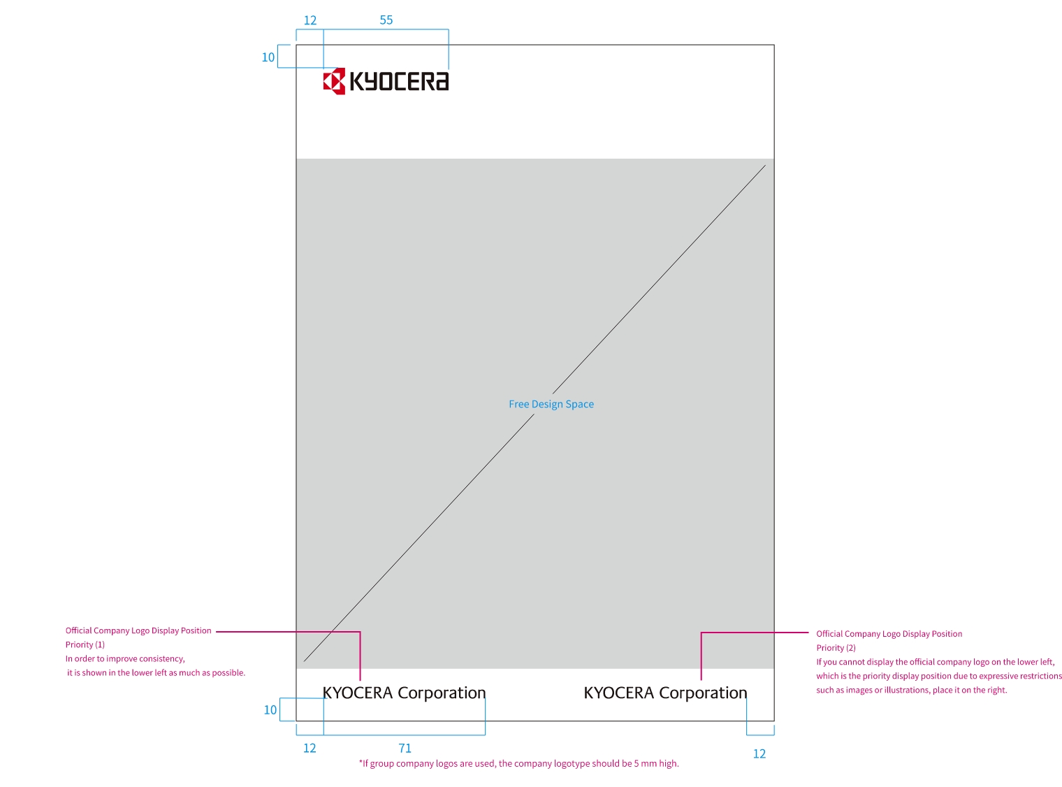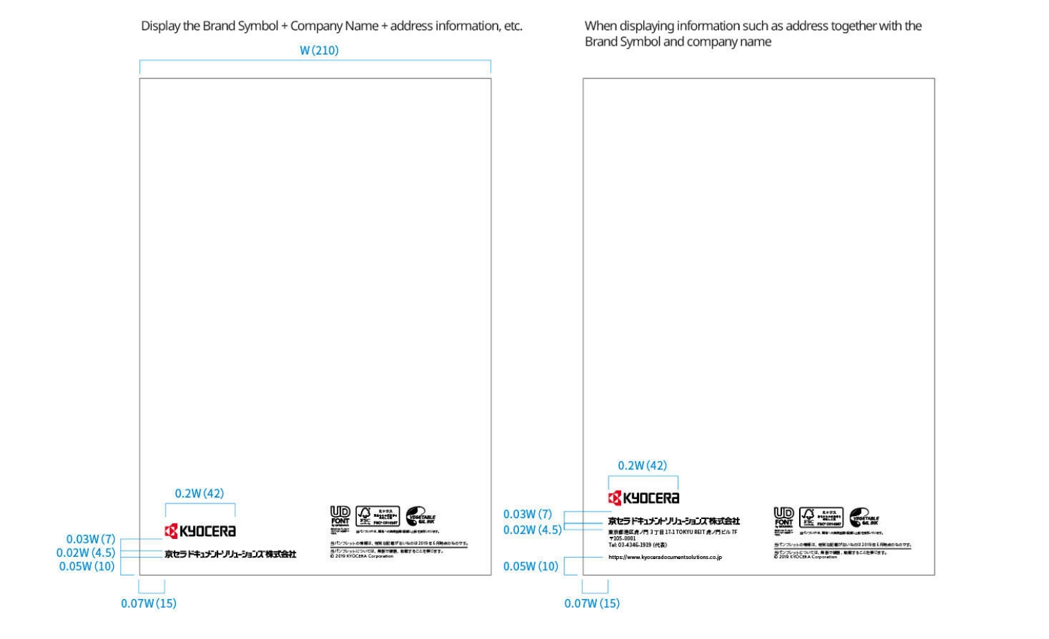 Place all information such as the brand symbol, company name logo, and address in the lower left. In principle, place the production date, copyright notice, and various certification marks in the lower right, separated from the corporate brand display area.
